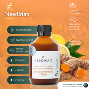 A NEEDMAX étrendkiegészítőnk liposzómás technológiával készült, így kiváló felszívódással képes hatékonyan, a megfelelő mennyiségben, a megfelelő helyre eljuttatni a hatóanyagokat. A C-vitamin a szervezet számos működésében részt vesz, megfelelő mennyiségű bevitele azért rendkívül fontos, mert az emberi szervezet – szemben az állatokkal – nem képes a C-vitamint előállítani. Értékes összetevői: Gyömbér, Piperin, Kurkuma, C-, E-, D-vitamin