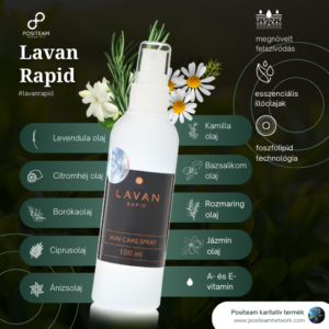 Termékünket általános mindennapi használatra ajánljuk, érzékeny bőrűek számára is. Az aromaterápiás LAVAN RAPID egy olyan bőrápoló spray, amelyben 9 illóolaj, valamint vitaminok (A-vitamin, E-vitamin) találhatóak meg. Értékes összetevői: Esszenciális olajok: Levendula illóolaj, Citromhéj illóolaj, Ánizsolaj, Bazsalikomolaj, Borókaolaj, Ciprusolaj, Jázminolaj, Kamillaolaj, Rozmaringolaj.